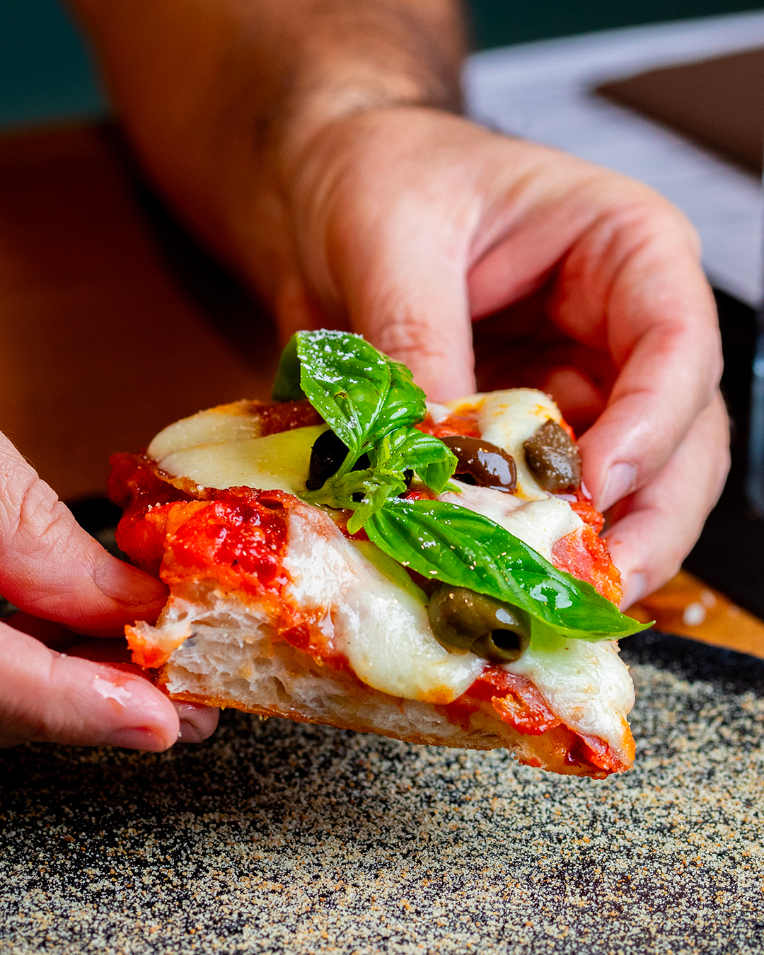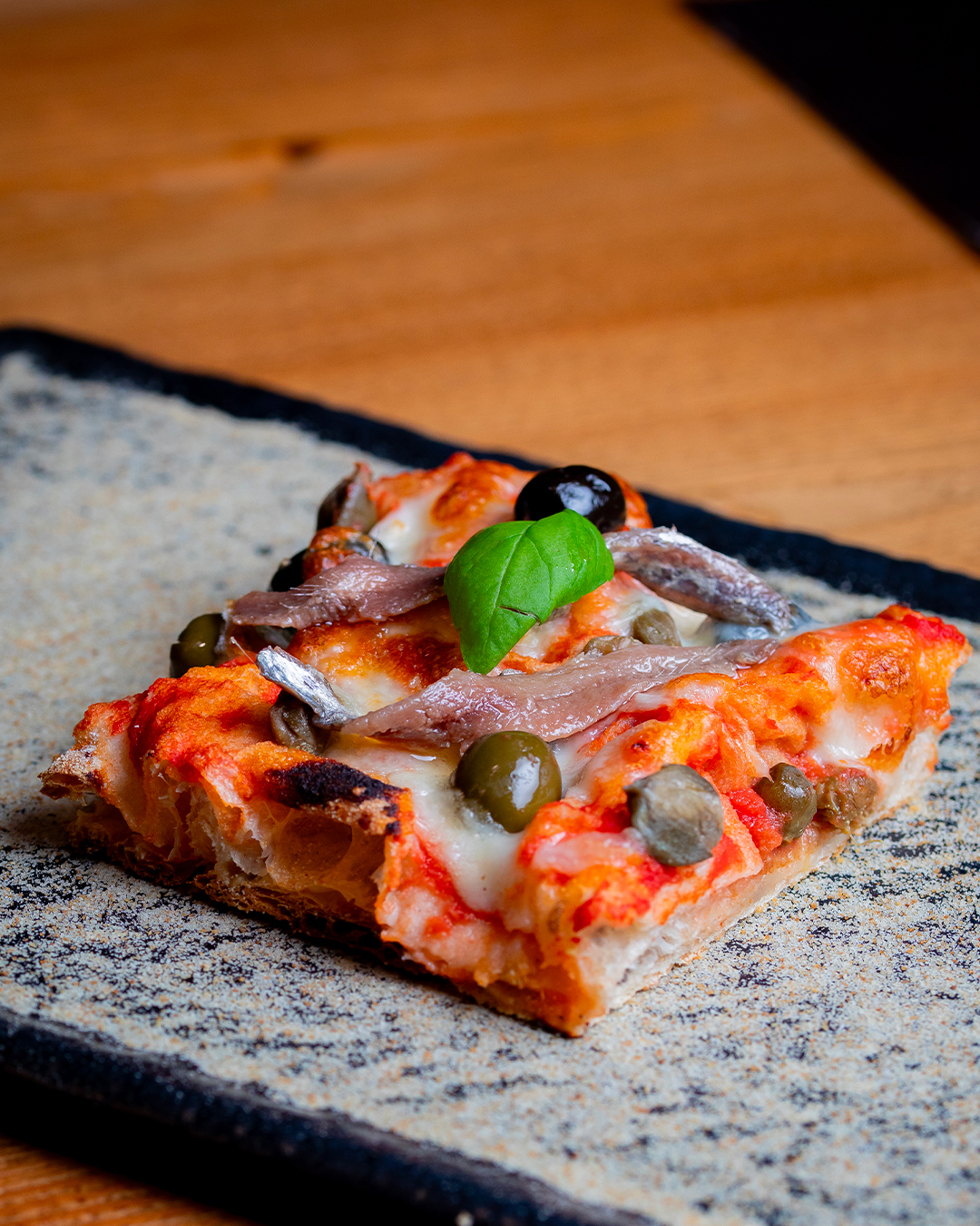 Pinza Acciughe: Salsa di Pomodoro, Fiordilatte, Olive Piccantine, Acciughe di Sciacca, Capperi