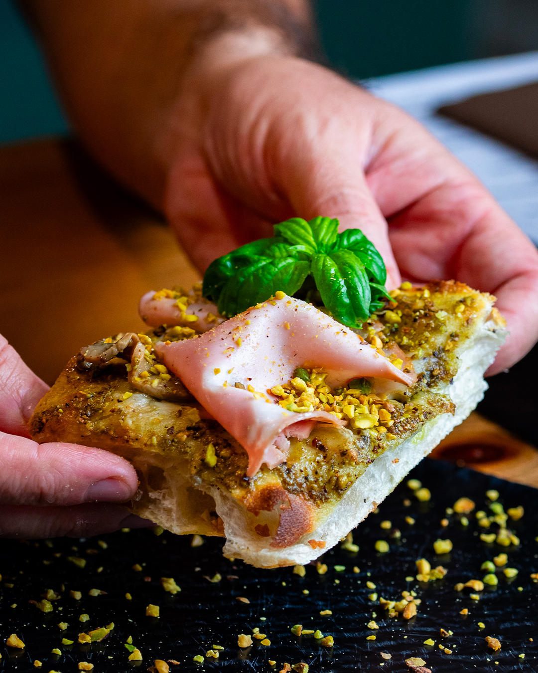 Pinza Bianca 4: Fiordilatte, Pesto di Pistacchio, Funghi Champignon, Mortadella IGP Bologna, Granella di Pistacchio, Caffè in Grani