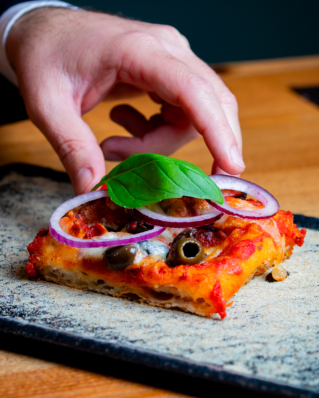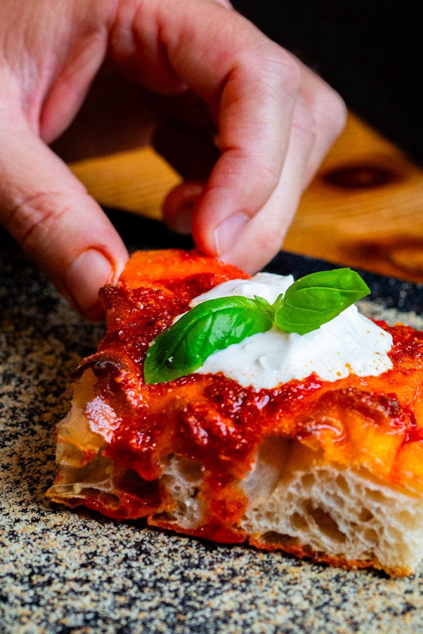 Pinza gourmet 2: Salsa di Pomodoro,'Nduja di Spilinga, Scaglie di Formaggio "L'Opera" 18 Mesi, Olive Piccantine e Fiordilatte in Forno, Cipolla Rossa Di Tropea