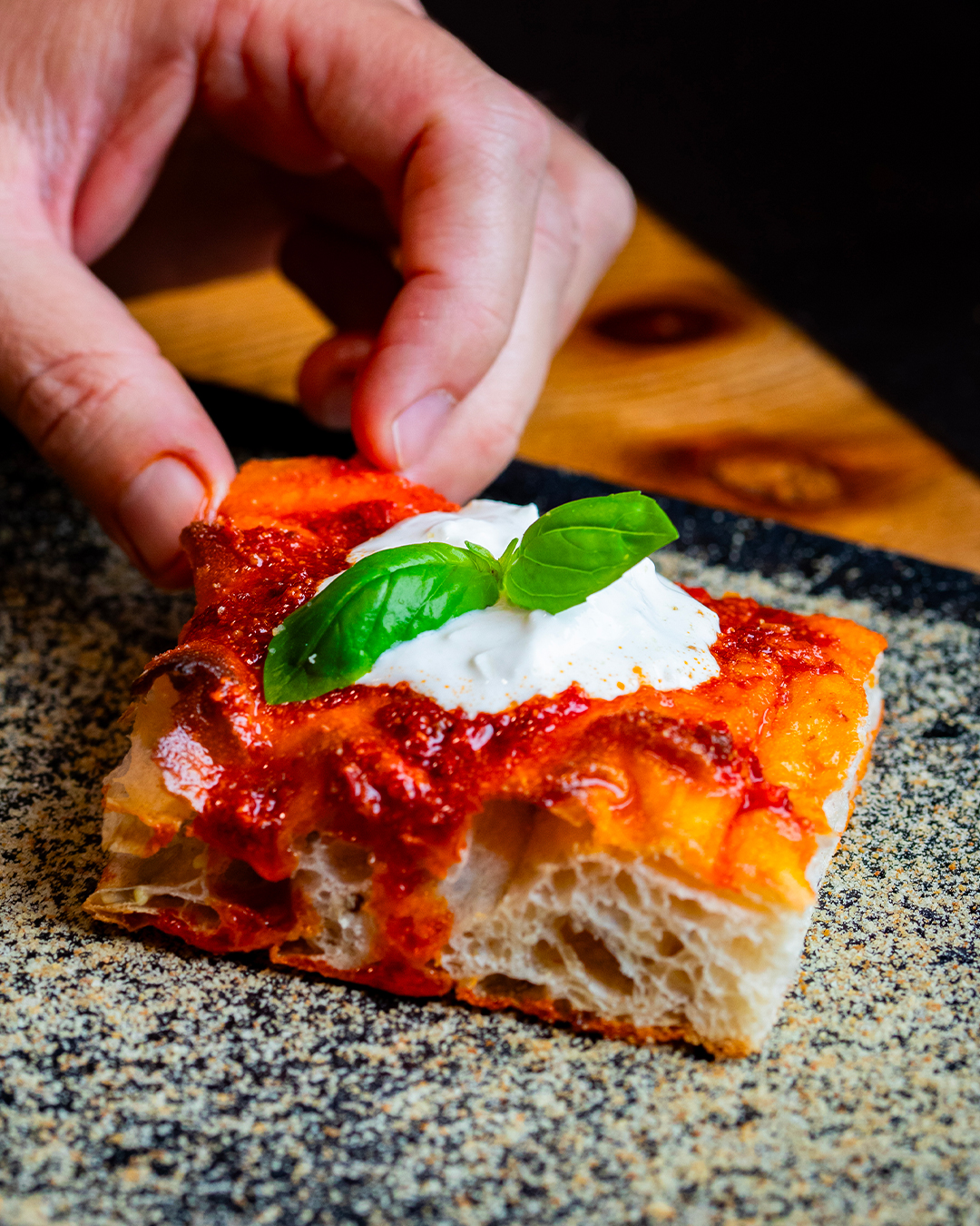 Pinza Diavola: Salsa di Pomodoro, Fiordilatte, 'Nduja di Spilinga, Olive Piccantine, Salame