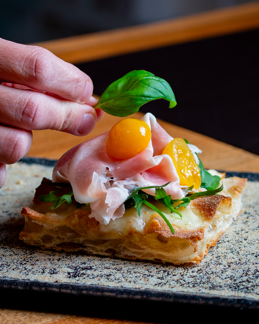 Pinza Crudo: Salsa di Pomodoro, Fiordilatte, Scaglie di Formaggio "L'Opera" 18 Mesi in Forno, Prosciutto Crudo di Parma DOP