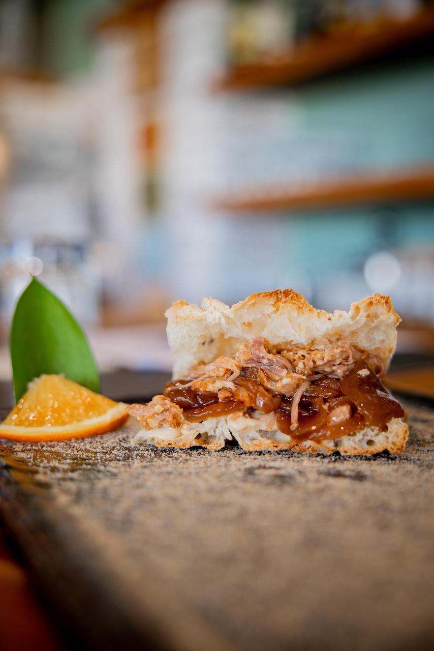 Pinza Gourmet 3: Focaccia, Stracciatella di Fiordilatte, Cotto di Praga, Cipolla Caramellata, Pomodorini Soleggiati